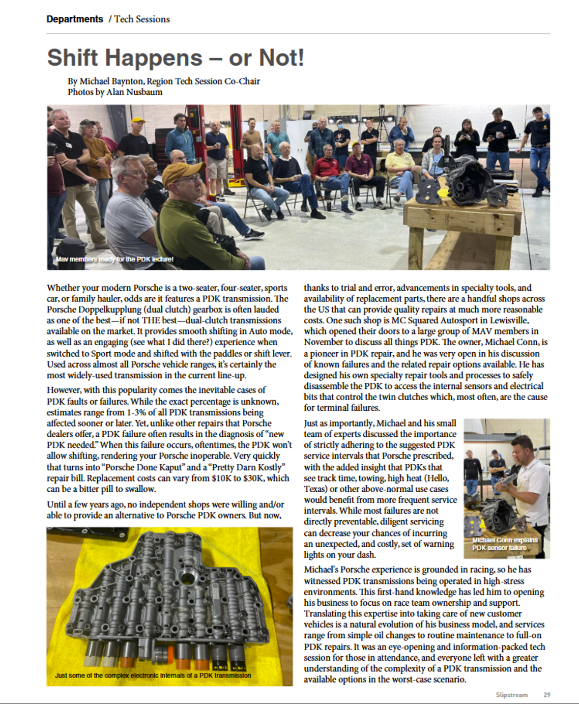 In the Slipstream February/March 2025 issue Porsche Club tech session was hosted by MC Squared Autosport in Lewisville, TX, led by renowned PDK expert Michael Conn.